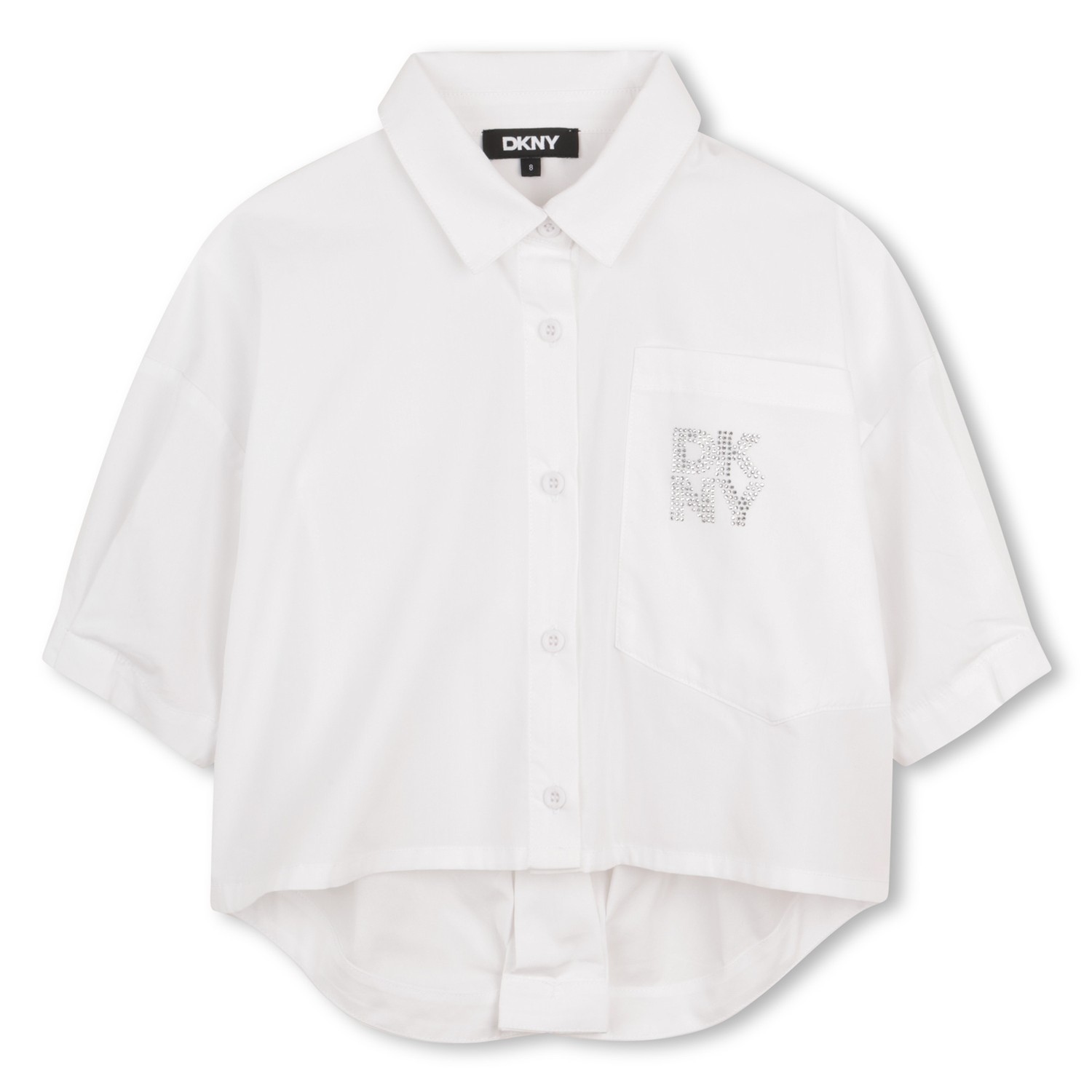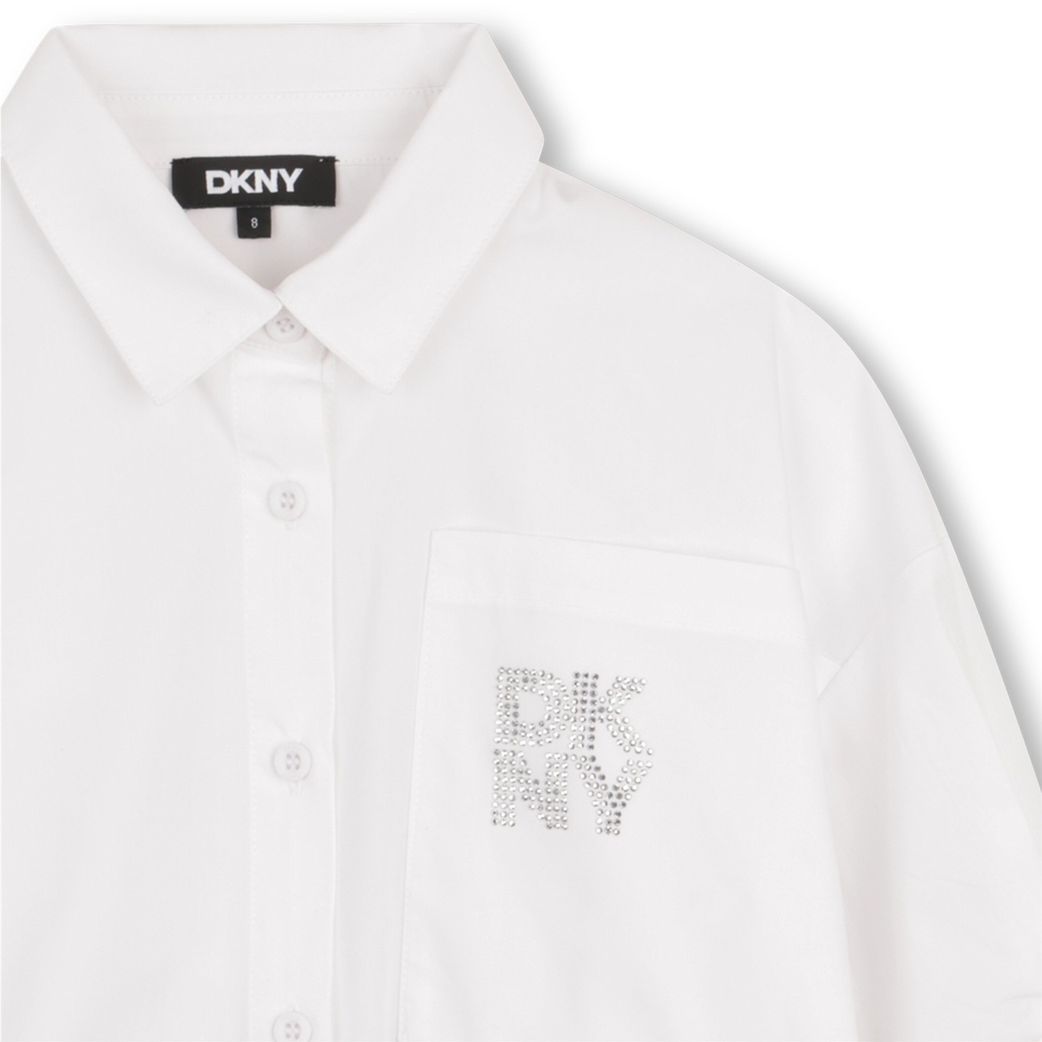 Lleva estilo al armario de tu hijo con esta camiseta Mini-me de algodón de popelina de DKNY. Con cierre de botones y bolsillo en el pecho adornado con el logo de pedrería, cada detalle está diseñado para aportar un toque de elegancia. Las mangas cortas y la apertura con botones aportan un toque de practicidad, mientras que el elegante pliegue trasero ofrece un aspecto único. Imprescindible para las mini fashionistas que disfrutan de brillar sin concesiones..